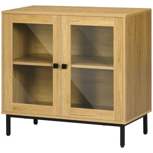 This Modern Glass Door Sideboard Buffet Dining Storage Cabinet in Oak Wood Finish has a 2-tier cabinet that offers bigger shelves to allow taller items easily, eliminating the frustration of belongings that don't fit. The double doors with cushioned hinged swing out, giving you easy access to everyday items while making it open and close smoothly. The clear glass brings elegance and romance to your interior design, allowing you to display precious memories and protect them from dust. Your home should be a secure place for the family. An anti-tipping strap is included so you can attach the accent cabinet to the wall. This Modern Glass Door Sideboard Buffet Dining Storage Cabinet in Oak Wood Finish with doors has exceptional solidity thanks to the MDF board structure supported by solid metal legs. The melamine coating on the surface is easy to clean. Overall Dimensions: 31.5" W x 15.75" D x 30" H. Weight Capacity: 66 lbs. (whole), 33 lbs. (shelf), 11 lbs. (top). Assembly required.